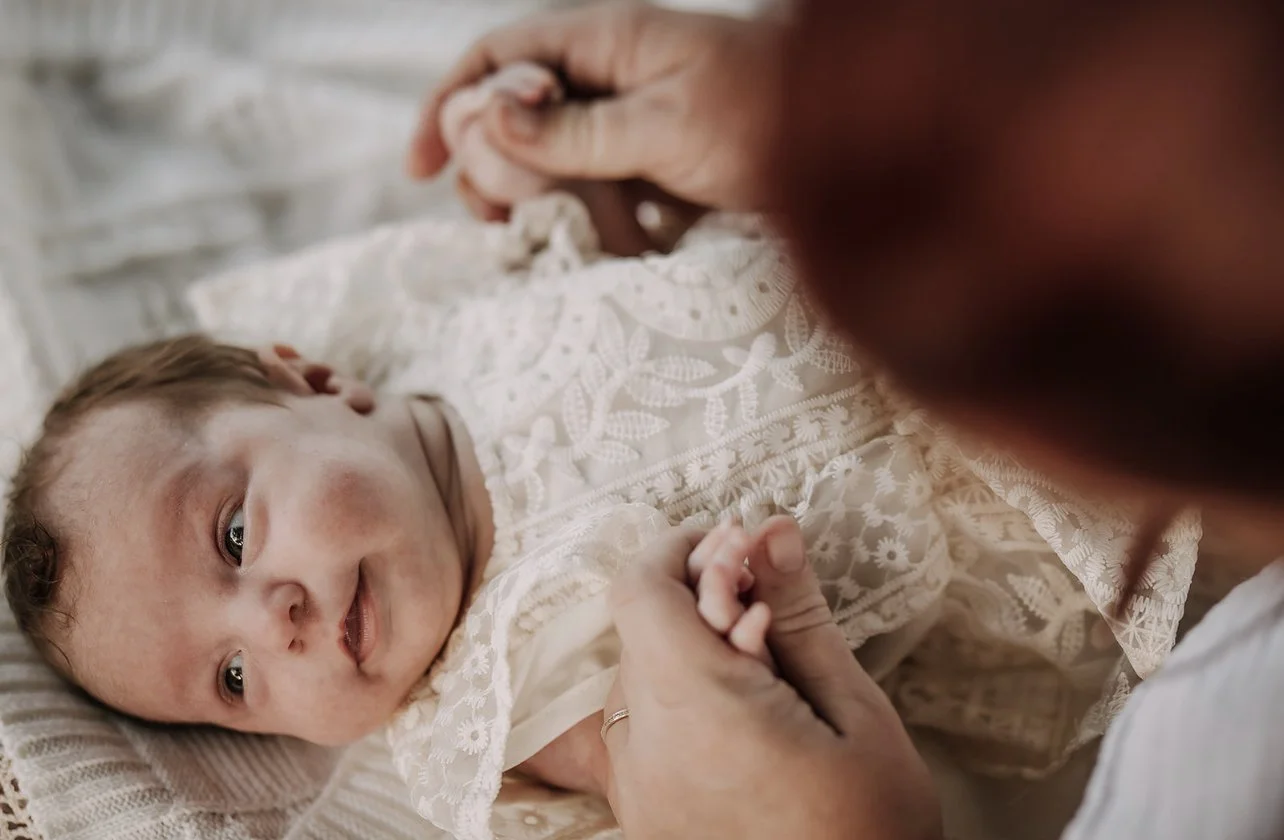 River and Andrea's newborn shoot beautifully captures the tender moments of early motherhood. The soft, natural light highlights the gentle touches and the quiet bond between Andrea and her newborn, River. Dressed in a delicate white lace outfit, River is cradled lovingly in Andrea's arms, showcasing the pure and simple beauty of these precious first days together.